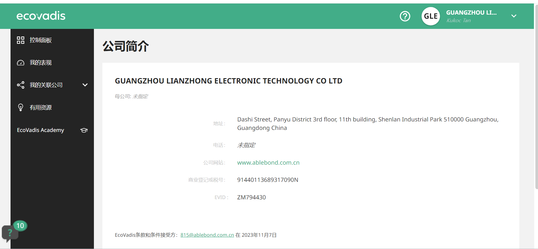 聯(lián)中電子已在EcoVadis官網(wǎng)上完成注冊并完成問(wèn)卷調查。審核結果及評分將于近期發(fā)布。